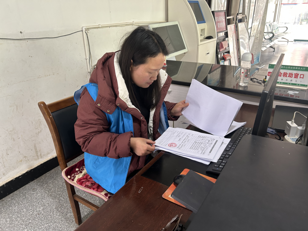 2月12日,腊尔山镇社工杨进在政务服务中心为前来递交临时救助申请的群众检查申请文件内容。